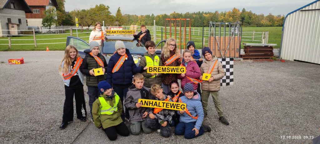 Die 3. Klasse nahm am Workshop “Hallo Auto” teil. Die Kinder durften selbst im Auto die Bremse betätigen und erfuhren dadurch die Länge des Bremsweges.